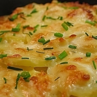Preheat the oven to 392°F. Arrange the potatoes in a circular pattern in the baking dish, overlapping each slice slightly (it’s easier to start from the center and work towards the edges). Pour the cheese mixture over the potatoes. Sprinkle with the remaining cheese and place small pieces of butter on top. Place the dish in the oven and bake for 45 minutes.