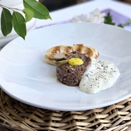 Place the tartare on a plate using a round mold. Crack a quail egg in the center of the tartare. Arrange the sauce and capers alongside.