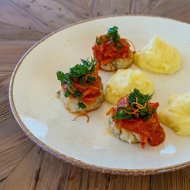 Place two patties on each plate, garnish with parsley, and serve with mashed potatoes and lecho sauce.