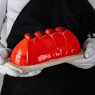 Pour 400 grams of strawberry mousse into a mold, let it cool, then pour in the strawberry jelly, cover with sponge cake, repeat with the strawberry mousse and again with sponge cake, let it cool, and after cooling, add the strawberry jelly.