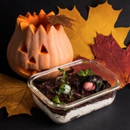 Spread the cream at the bottom of a deep serving dish, sprinkle with chocolate crumbs, and decorate with microgreens, chocolate eggs, and gummy insects.