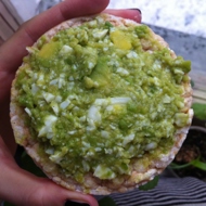 One avocado and one egg are enough for two sandwiches. I spread this mixture on rice cakes. It turned out very tasty and healthy.