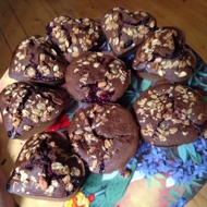 In silicone muffin molds, add 1–1.5 tablespoons of chocolate batter, then 1–1.5 teaspoons of cherry filling, and top with more batter to completely cover the cherry layer, filling the molds to ¾ full.