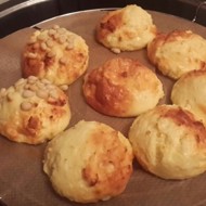 While the air fryer is heating, place baking paper on the middle rack (I trim the edges of the sheet to fit the rack shape so that the long edges don’t curl and obstruct the hot air from cooking the pancakes). Place the cottage cheese balls on the paper and shape them as needed. This makes 8 pancakes. I do not coat them in flour.