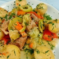 Insert the whole head of garlic, the whole chili pepper, and a few sprigs of herbs, cover everything with whole cabbage leaves to keep all the steam inside, tightly cover with a lid, and cook on low heat for 1.5 to 2 hours.