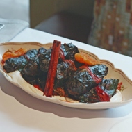 Tear the remaining prunes and apricots (if using) by hand and place them in the gaps between the stuffed grape leaves. Lay cinnamon sticks on top of the stuffed grape leaves.