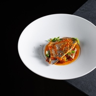 Place the Neapolitan sauce on a plate, and top it with a piece of dorado fillet.
