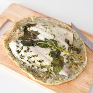 On a piece of dough, place two fish fillets, sprinkle with a pinch of salt, drizzle with lemon juice, and top with a sprig of thyme and mint.