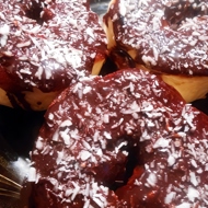 Spoon the glaze onto each doughnut and sprinkle with shredded coconut.