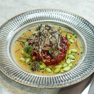 Prepare the ponzu sauce by mixing 30 grams of soy sauce, 5 grams each of lemon and lime juice, 10 grams each of orange and grapefruit juice, and 10 grams of mirin. On a plate, place the guacamole, topped with watermelon tartare, and garnish with edamame beans, daikon, nori, and sesame seeds. Drizzle with the ponzu sauce.