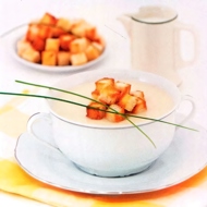 Whip the sour cream with the yolks and gently fold it into the soup. Serve hot, sprinkled with wheat croutons.