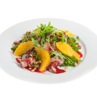 Combine the arugula with the orange dressing, place it on a serving plate, top with pieces of duck, drizzle them and the salad with cranberry sauce, arrange the orange fillets, and sprinkle the finished salad with toasted pine nuts.