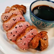 Once the skin is nicely browned, flip the duck and reduce the heat to medium.