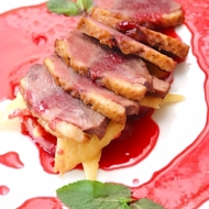 Meanwhile, poke the skin of the duck breasts in several places with a fork, being careful not to pierce the meat. Season with salt and generously rub with pepper. Heat a skillet over medium heat and place the meat skin-side down, cooking until golden and crispy, about 15 minutes. Flip and cook for another 8 minutes for medium doneness. Transfer to a plate and let rest for 10 minutes.