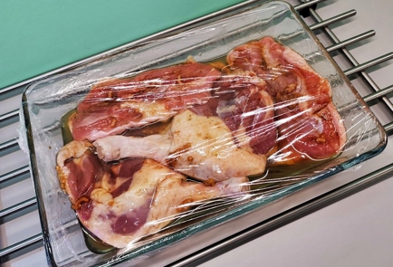 Pack the legs in marinade into a roasting bag, make several holes with a toothpick, and seal. Place in a preheated oven at 356°F for 80 minutes.