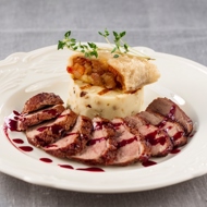 On a plate, place the mashed potatoes, top with the strudel, and fan out the sliced duck, drizzle with sauce, and garnish with a sprig of herbs.