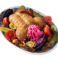 Let the duck rest for another 10 minutes, then place it on a large platter along with the side dish. Serve homemade pickles with the duck - red and green tomatoes, barrel cucumbers, and Georgian cabbage.