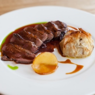 On a plate, place a small amount of wine-braised cabbage, sliced duck breast, one crispy pouch, and a slice of mango poached in spices. Drizzle with caramel sauce and garnish with basil oil.
