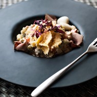 Gently mix all the prepared ingredients, except for the duck, using a silicone spatula to avoid breaking their shape. Add mayonnaise, and season with salt and pepper to taste. Top with the duck fillet.