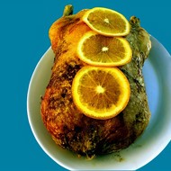 Serve the cooked duck with orange slices and finely chopped parsley.