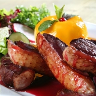 Cut the processed duck into pieces and fry in duck fat until a golden crust forms.