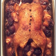 Preheat the oven to 392°F. Place the duck on a baking sheet and roast for about 40 minutes. After that, surround the duck with plums, pour in the remaining wine, season with salt and pepper, and continue roasting for another 30–40 minutes until fully cooked.