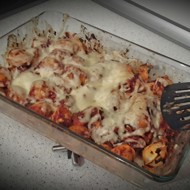 Pour the dumplings into a baking dish and mix with the cheese and sautéed vegetables.