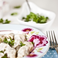 Roll the dough into a tube, cutting off 2 cm circles, and roll each piece thinly for the dumplings. You can also roll out the dough and cut it with a glass. Place the filling on top. Shape the dumplings and boil them in salted boiling water until they float. Serve with crème fraîche.