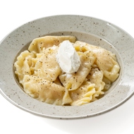 Add the sauerkraut, after squeezing out the excess water, to the onions and simmer covered until tender. At the end, taste and add salt or sugar if necessary. Allow the filling to cool before shaping the dumplings.