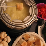 Grate the inside of the fondue pot with half an onion and place it on the heat. Pour in the milk and bring it to a boil, then gradually add the grated cheese. Keep it on the heat until the cheese melts, stirring constantly. Add the caraway seeds to the milk and cheese mixture.