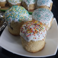 While the kulich are warm, brush them with glaze and immediately decorate them so that the crumbs stick to the glaze.