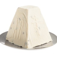 Invert the finished Easter dessert onto a plate, remove the mold, and then take off the cheesecloth.