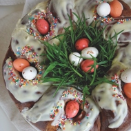 Once the glaze has dried, place the decorative eggs into the indentations.