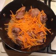 Add the meat to the hot fat and fry it. As soon as a crust forms, add the carrot (the strips should sizzle actively upon immersion), and after 5β7 minutes, add the onion. Do not reduce the heat or cover with a lid. If there is not enough rendered fat, add a little vegetable oil. And salt to taste.