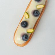 Dip one side of the finished éclair in melted white or dark chocolate, and once the chocolate has set, decorate it with fresh blueberries and pistachios.