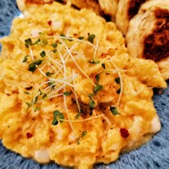 As soon as the mixture is fully set, the delicate filling for pancakes is ready!