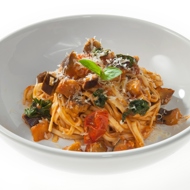 Cut the eggplants into 1.5 cm cubes. Halve the cherry tomatoes. Finely chop the garlic.
