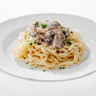 Place the noodles on a plate in a nest shape and spoon the mushrooms with cream into the center.