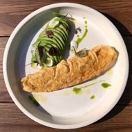 Slice a ripe avocado (for example, a Hass variety) and arrange it on the plate next to the omelet.