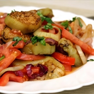 Fry the eggplants and onions separately, boil the chicken breast and cut it.