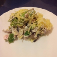 Combine all the ingredients, add the chopped lettuce leaves. Dress with the sauce and sprinkle with crumbled blue cheese.