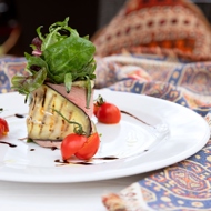 On a slice of eggplant, place a slice of roast beef, a bit of sauce, sun-dried tomatoes, and the salad mix.