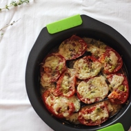 Preheat the oven to 446°F. In a round or square dish greased with oil, layer the eggplant slices, then a layer of tomatoes, spread a thin layer of pesto, and add a layer of grated suluguni. Repeat the eggplant-tomato-pesto layers once more, ensuring the top layer of cheese is thicker than the previous one. Season with pepper and place in the oven for 20-30 minutes.