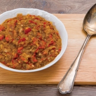 Bake the eggplant in a preheated oven at 428°F for 30 minutes, let it cool, peel, and finely chop.