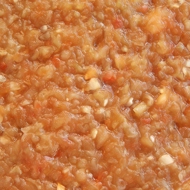 Bake or boil the eggplants, remove the skin, chop the pulp, add lightly sautéed onion and tomato, salt, pepper, vegetable oil, and a little vinegar.