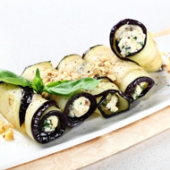 On the slices of cooked eggplant, use a spoon to place the filling and roll them up. Garnish the finished dish with herbs and serve.