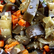 Cut the eggplants and carrot into cubes (cut the carrot smaller) and boil in salted water, adding minced garlic and ground red pepper. Add salt.