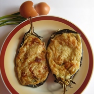 Remove the eggplants from the oven and carefully scoop out the flesh, leaving a 0.5 cm layer at the bottom.