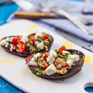 Make a slit in the soft inner part of the eggplant and fill it with the prepared tomato sauce. Top with chopped herbs, diced feta cheese, sliced red onion, and capers. Sprinkle with salt and pepper, and drizzle with olive oil.