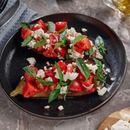 Place the chopped vegetables and cheese on the halved cooked eggplants. Serve immediately.